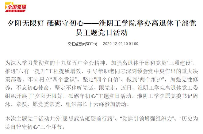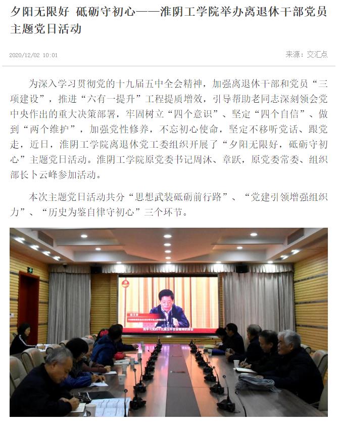 为深入学习贯彻党的十九届五中全会精神,加强离退休干部和党员“三项建设”,推进“六有一提升”工程提质增效,引导帮助老同志深刻领会党中央作出的重大决策部署,牢固树立“四个意识”、坚定“四个自信”、做到“两个维护”,加强党性修养,不忘初心使命,坚定不移听党话、跟党走,近日,淮阴工学院离退休党工委组织开展了“夕阳无限好,砥砺守初心”主题党日活动。淮阴工学院原党委书记周沐、章跃,原党委常委、组织部长卜云峰参加活动。