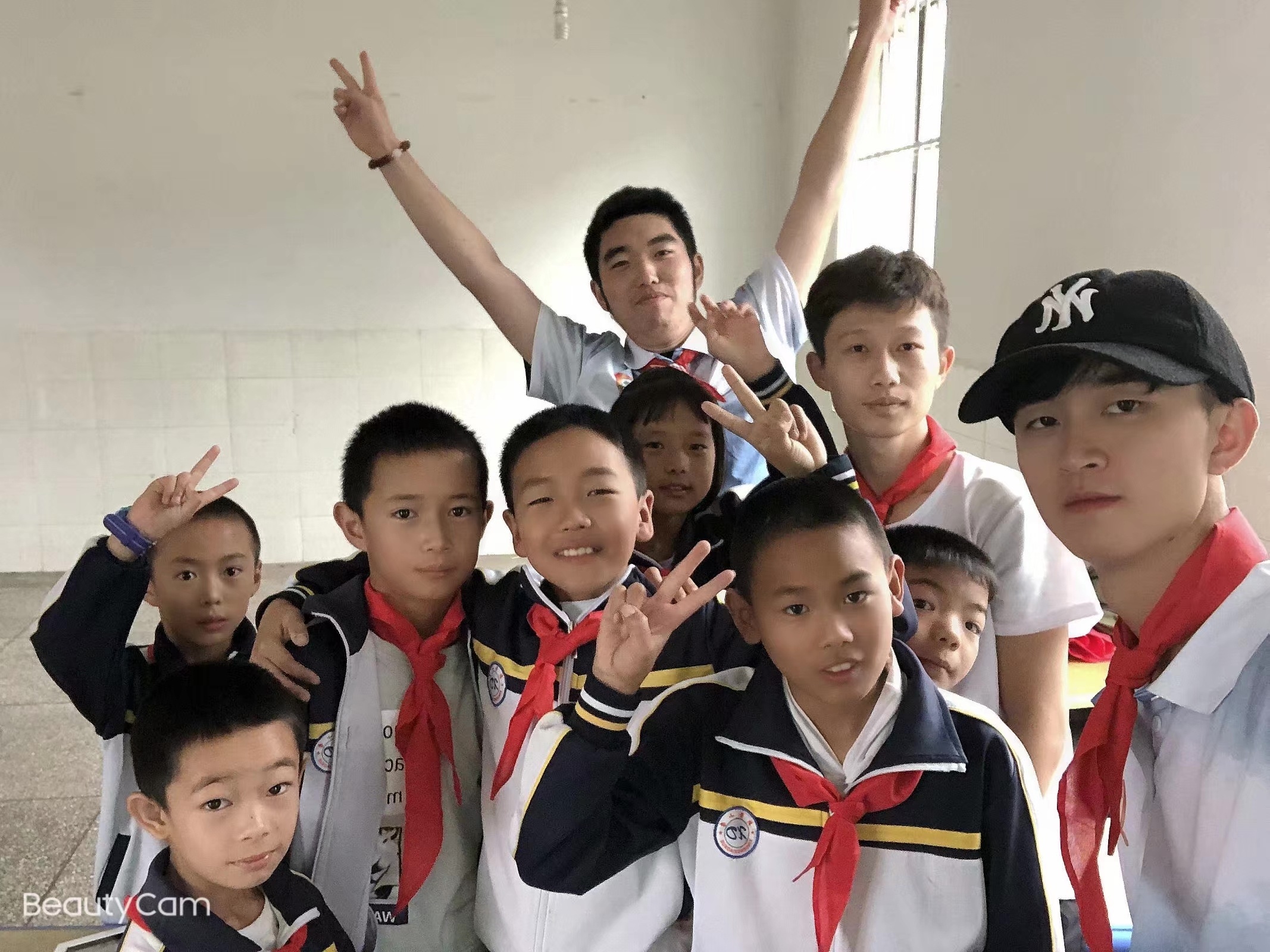 为志愿者与新登小学孩子们合影
