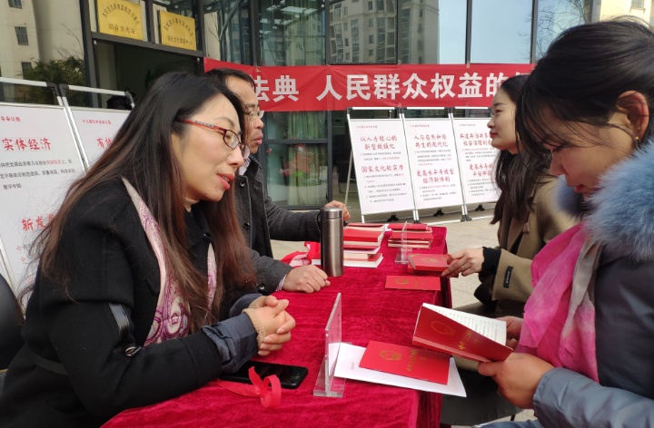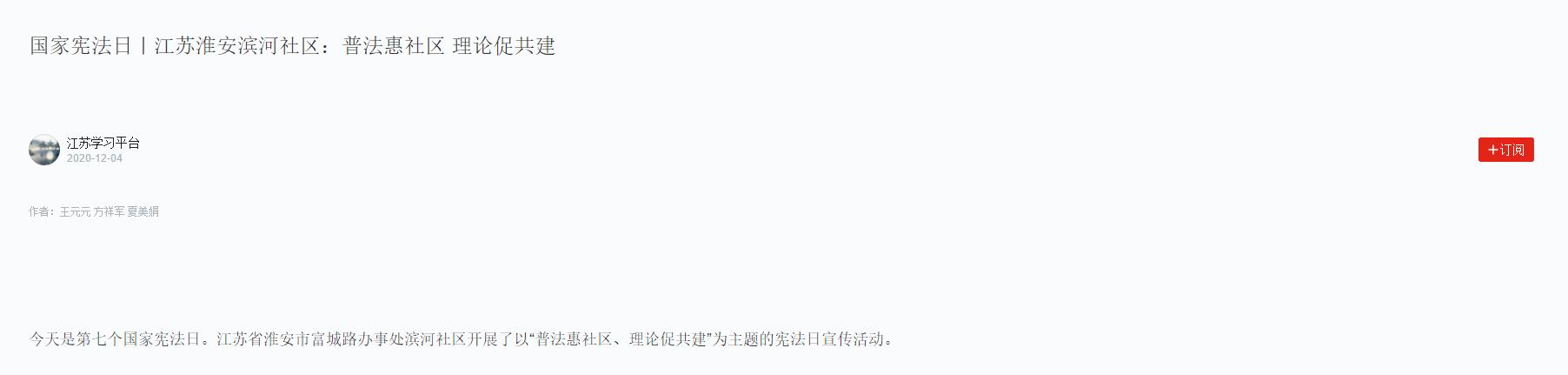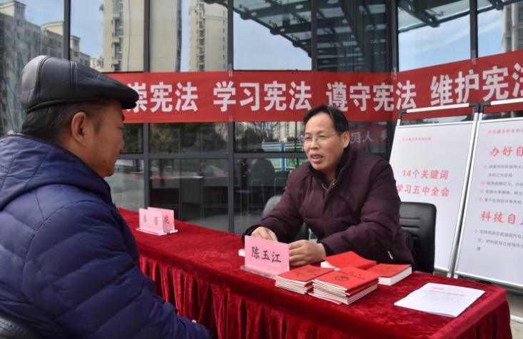 今天是第七个国家宪法日。江苏省淮安市富城路办事处滨河社区开展了以“普法惠社区、理论促共建”为主题的宪法日宣传活动。