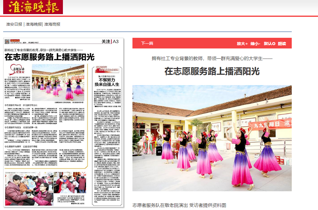 据了解,志愿者服务队所在的人文学院为每个小组选派两名社会工作专业教师作为指导老师,全程作为志愿服务进行专业督导;根据不同服务群体,组建青少年服务小组,对接社会需求,积极承接社会服务项目;与淮安市三堡乡初级中学、三堡乡中心小学定期开展“一米阳光,携手成长”留守儿童公益夏令营活动,针对儿童缺乏自信心、社会适应力差问题开展特色社会工作服务;组建老年人服务小组,与颐园敬老院建立长期的志愿服务合作关系,为敬老院老人们提供物质帮助、生活照料与社会支持。