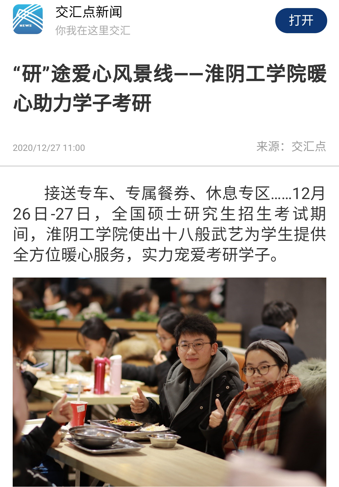 接送专车、专属餐券、休息专区……12月26日-27日,全国硕士研究生招生考试期间,淮阴工学院使出十八般武艺为学生提供全方位暖心服务,实力宠爱考研学子。