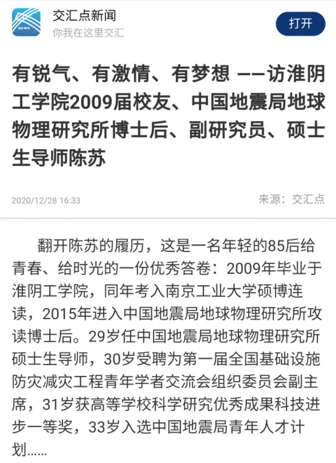 翻开陈苏的履历,这是一名年轻的85后给青春、给时光的一份优秀答卷:2009年毕业于淮阴工学院,同年考入南京工业大学硕博连读,2015年进入中国地震局地球物理研究所攻读博士后。29岁任中国地震局地球物理研究所硕士生导师,30岁受聘为第一届全国基础设施防灾减灾工程青年学者交流会组织委员会副主席,31岁获高等学校科学研究优秀成果科技进步一等奖,33岁入选中国地震局青年人才计划……