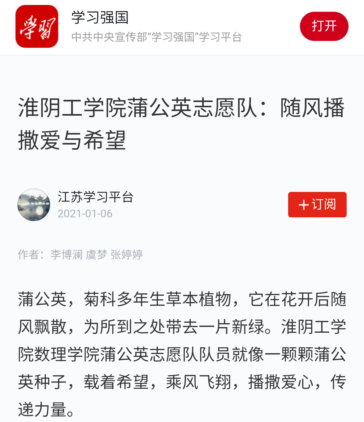 蒲公英,菊科多年生草本植物,它在花开后随风飘散,为所到之处带去一片新绿。淮阴工学院数理学院蒲公英志愿队队员就像一颗颗蒲公英种子,载着希望,乘风飞翔,播撒爱心,传递力量。