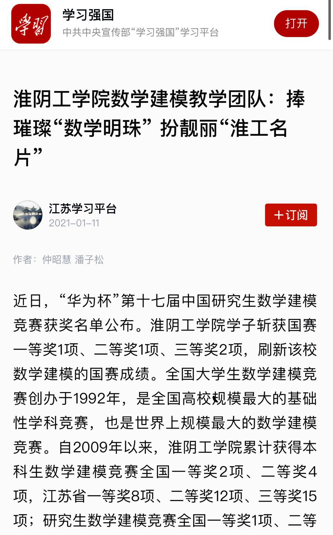 近日,“华为杯”第十七届中国研究生数学建模竞赛获奖名单公布。淮阴工学院学子斩获国赛一等奖1项、二等奖1项、三等奖2项,刷新该校数学建模的国赛成绩。全国大学生数学建模竞赛创办于1992年,是全国高校规模最大的基础性学科竞赛,也是世界上规模最大的数学建模竞赛。自2009年以来,淮阴工学院累计获得本科生数学建模竞赛全国一等奖2项、二等奖4项,江苏省一等奖8项、二等奖12项、三等奖15项;研究生数学建模竞赛全国一等奖1项、二等奖2项、三等奖8项。