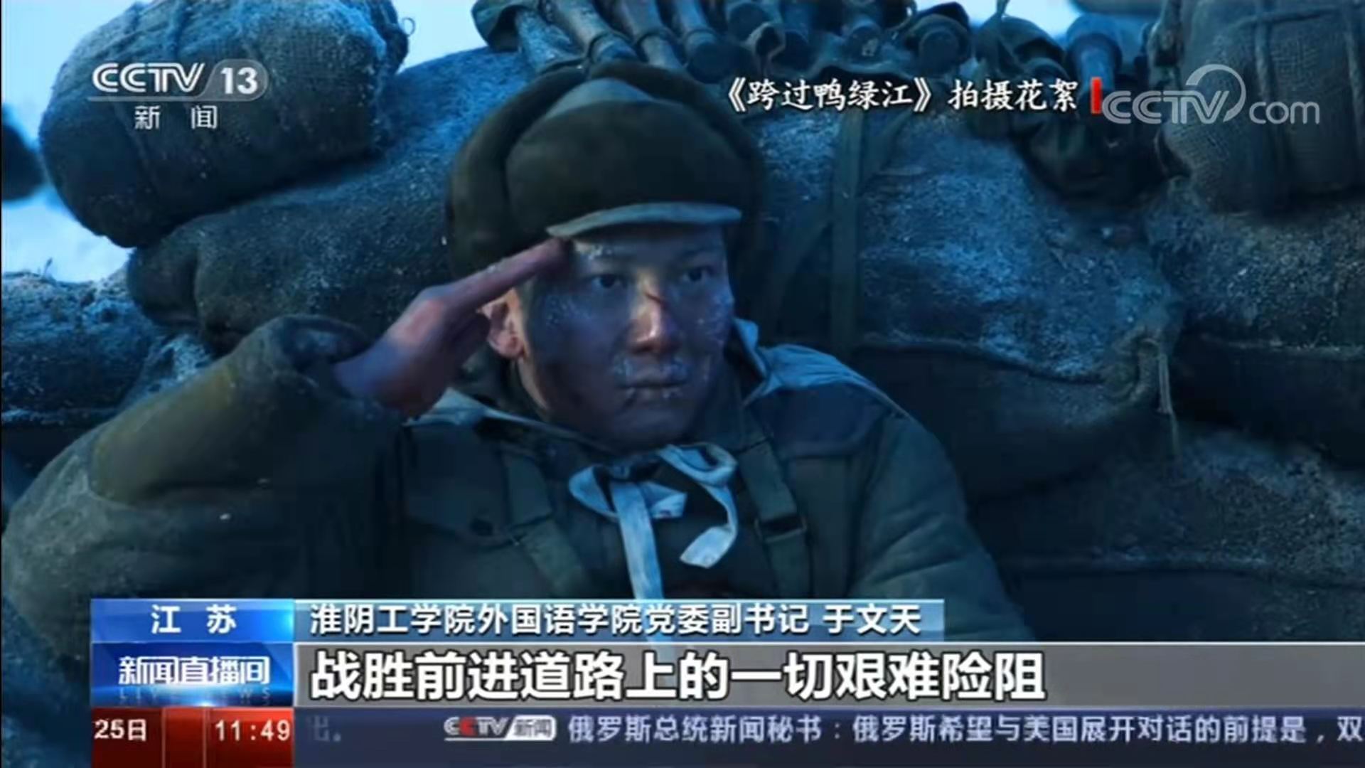 由中央广播电视总台出品的重大革命历史题材电视剧《跨过鸭绿江》昨晚在央视综合频道黄金时间播出大结局。“我被志愿军的英勇无畏、不怕牺牲、保家卫国的精神深深震撼了。作为一名教育工作者,我想就是通过我们的工作,教育和引导我们的青年学生,在党的领导下,战胜前进道路上的一切艰难险阻,实现中华民族伟大复兴的伟业。”淮阴工学院外国语学院党委副书记于文天表示。