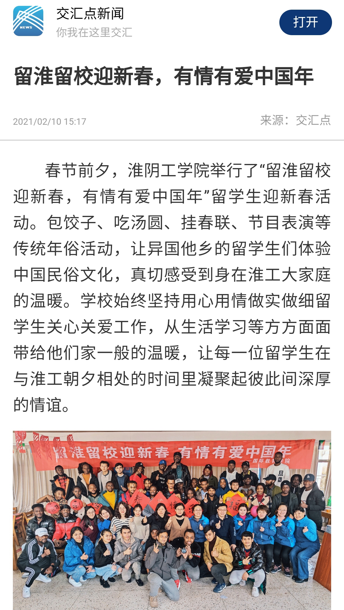 2020年是不平凡的一年,新冠肺炎疫情发生以来,学校始终把守护师生的健康放在首位,有序高效做好疫情防控工作。国教院采取了讲“力度”重“温度”有“效度”的管理方式,把学校的关怀传至每一位留学生,化解他们的恐惧和担忧,促进理解和信任,凝聚起师生间深厚的情感。“我在淮工很好,老师们像家人一样关心着我,防控措施也非常严格,很安全很安心。”寒假留在学校的学生可赞在与家人通话时说。