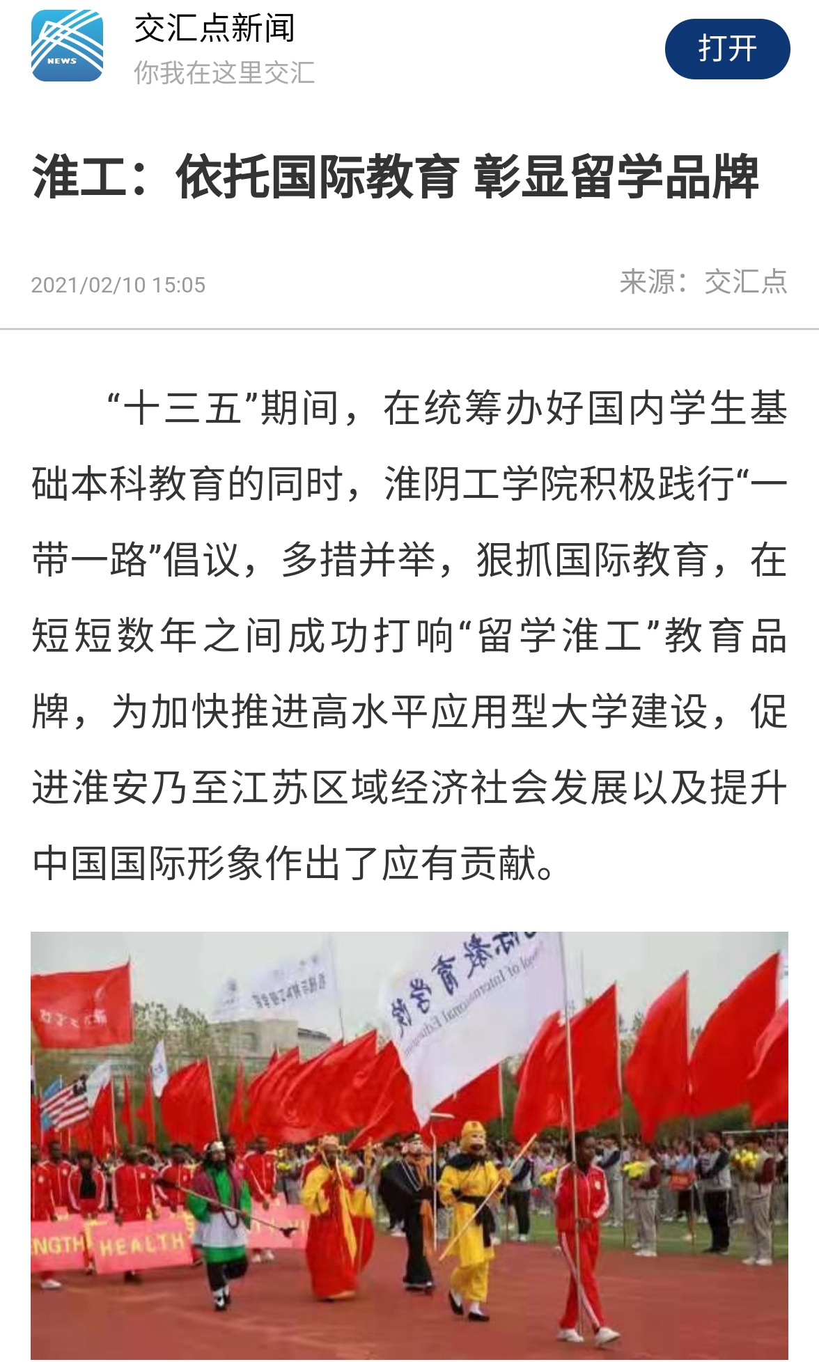 广泛参与活动,扩大品牌影响。在抓好基本知识学习的同时,该校还积极鼓励留学生踊跃参加各级各类赛事活动与社会活动,广泛开展校外交流和展示,获得了一系列奖项与荣誉,扩大了“留学淮工”的品牌影响。