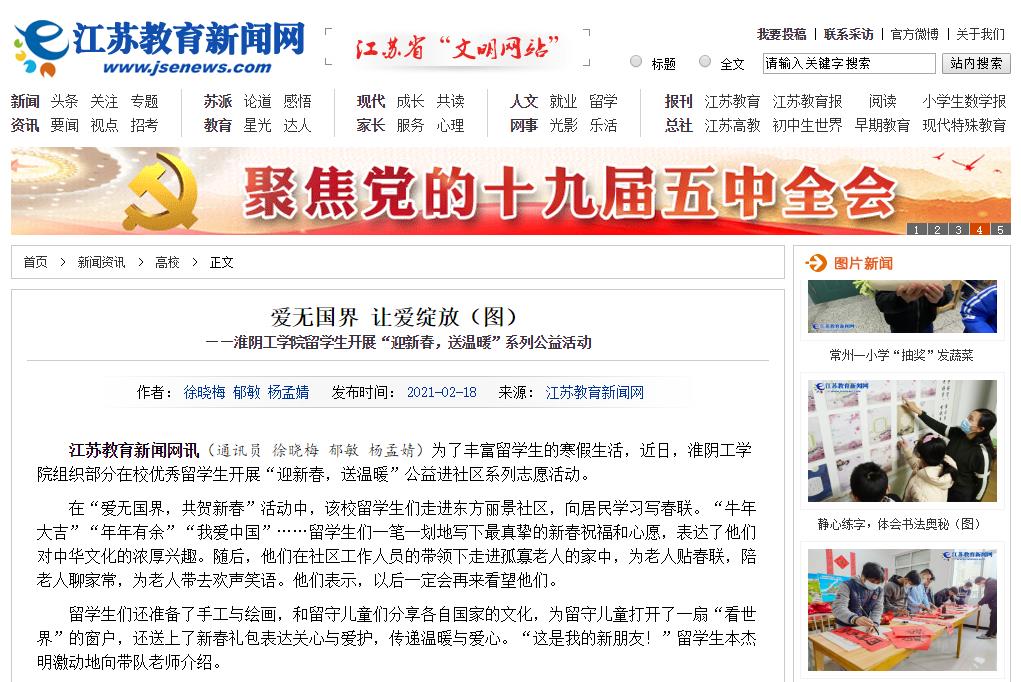 在由中国计生协“暖心家园”项目点淮安市清江浦区爱心志愿者服务社主办的春节联谊活动中,该校留学生们为计生特殊家庭送上鲜花,用中文献上诗朗诵《新年,你好》和乌兹别克斯坦民族舞蹈等文艺节目,向居民们送上真挚的新春祝福。留学生罗青北和艾瑞克在接受淮安电视台采访时说:“我们在淮安过年挺好的,祝大家新年快乐!”