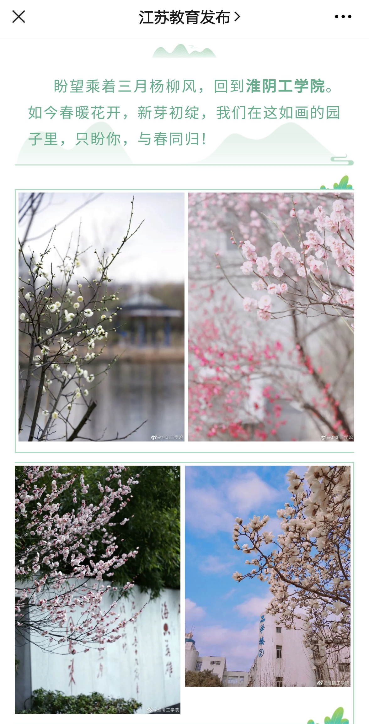 盼望乘着三月杨柳风,回到淮阴工学院。如今春暖花开,新芽初绽,我们在这如画的园子里,只盼你,与春同归!