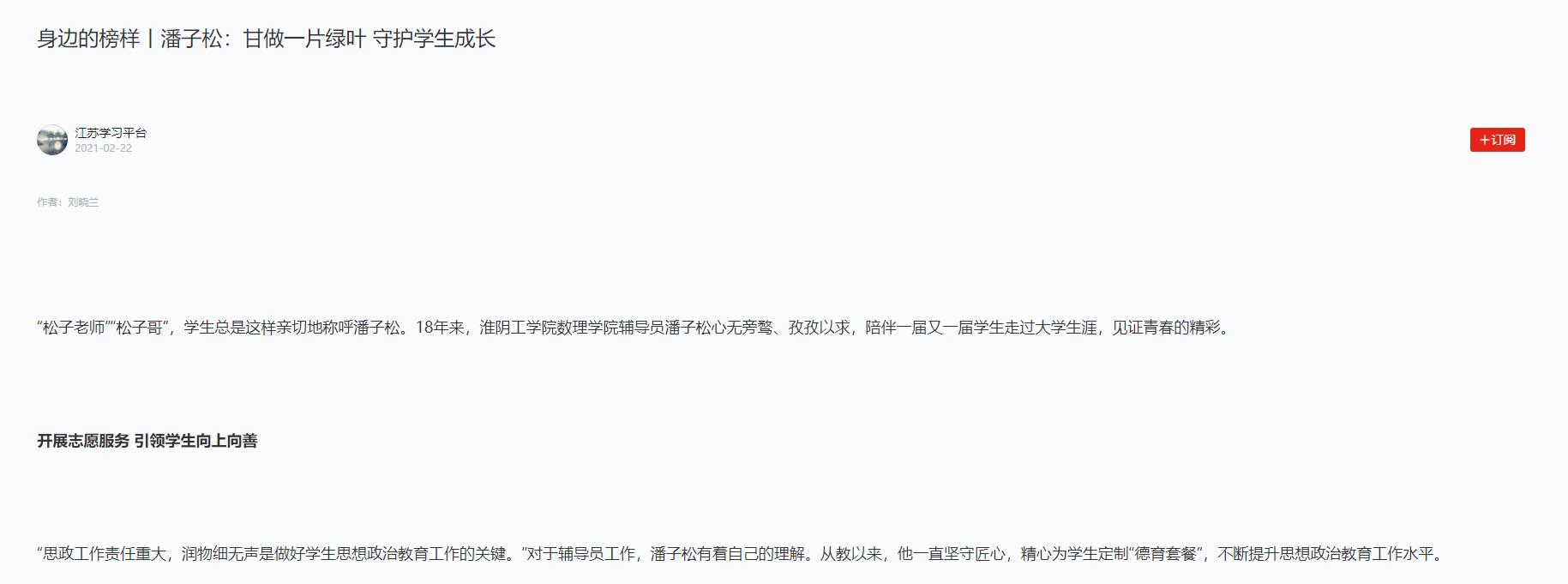 “松子老师”“松子哥”,学生总是这样亲切地称呼潘子松。18年来,淮阴工学院数理学院辅导员潘子松心无旁骛、孜孜以求,陪伴一届又一届学生走过大学生涯,见证青春的精彩。