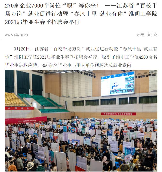 3月20日,江苏省“百校千场万岗”就业促进行动暨“春风十里 就业有你”淮阴工学院2021届毕业生春季招聘会举行,吸引了淮阴工学院4200余名毕业生进场应聘,850余名毕业生与用人单位现场达成就业意向。