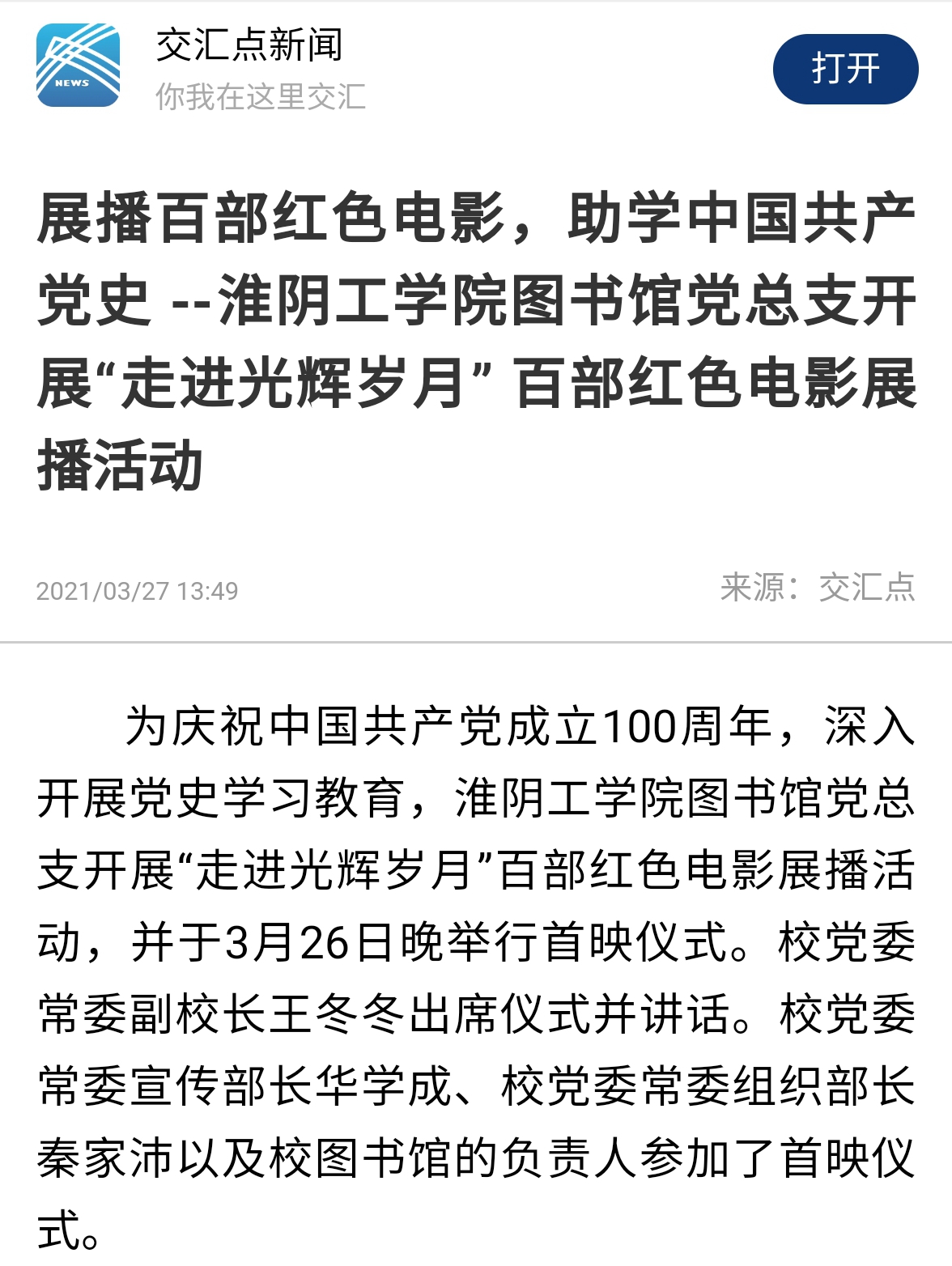 为庆祝中国共产党成立100周年,深入开展党史学习教育,淮阴工学院图书馆党总支开展“走进光辉岁月”百部红色电影展播活动,并于3月26日晚举行首映仪式。校党委常委副校长王冬冬出席仪式并讲话。校党委常委宣传部长华学成、校党委常委组织部长秦家沛以及校图书馆的负责人参加了首映仪式。