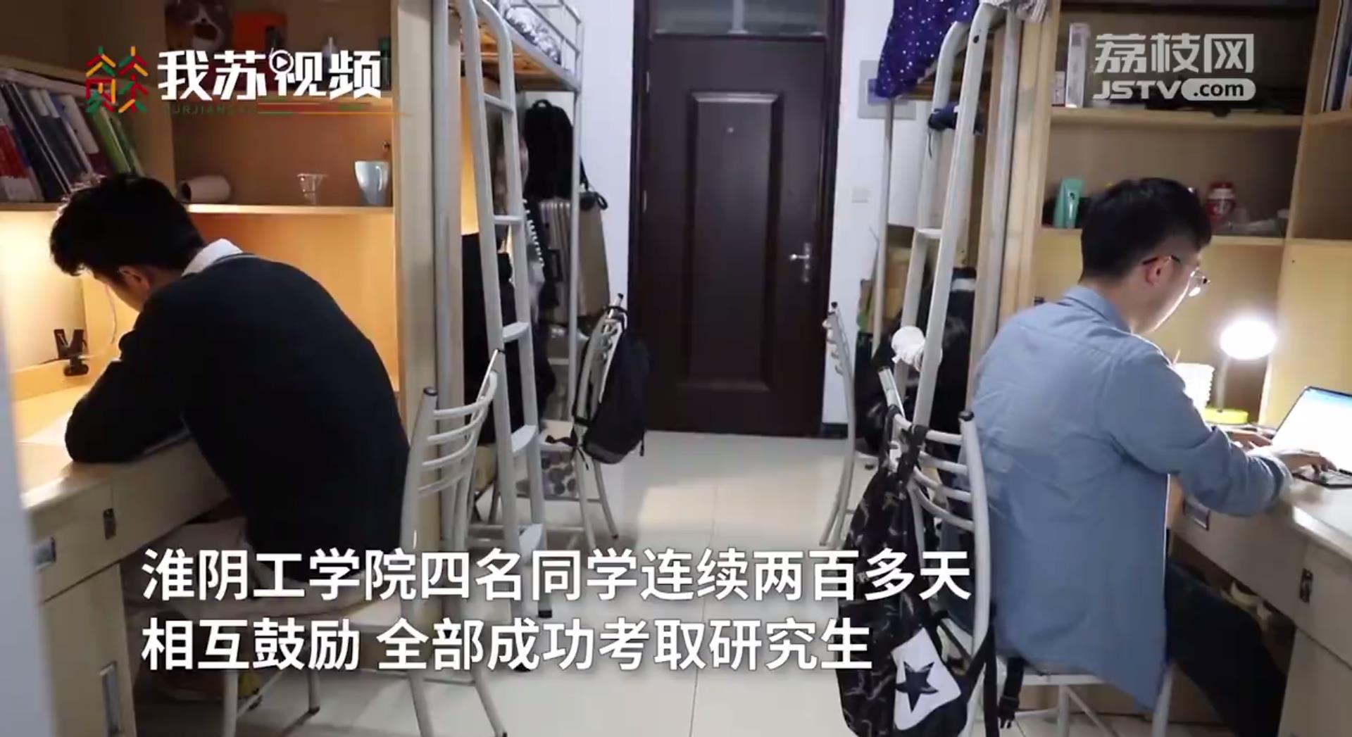 淮阴工学院计算机学院有一个学霸宿舍,同一专业4人考研全上岸,他们已经连续200多天互相加油。4名男生介绍,在考研期间,他们每天早上起床、晚上睡觉前都会互相说一句:你一定能考上研究生!4个人都说感谢室友,遇见他们三生有幸。