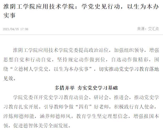 淮阴工学院应用技术学院党委提高政治站位,加强组织领导,增强思想自觉和行动自觉,坚持规定动作做到位,自选动作做精彩,围绕“立德树人学党史,以生为本办实事”,切实推动党史学习教育落地见效。