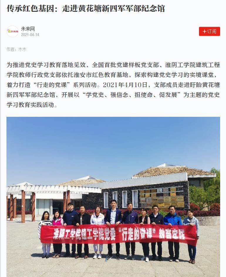 为推进党史学习教育落地见效,全国首批党建样板党支部、淮阴工学院建筑工程学院教师行政党支部依托淮安市红色教育基地,探索构建党史学习的实境课堂,着力打造“行走的党课”系列活动。2021年4月10日,支部成员走进盱眙黄花塘新四军军部纪念馆,开展以“学党史、强信念、担使命、促发展”为主题的党史学习教育实践活动。