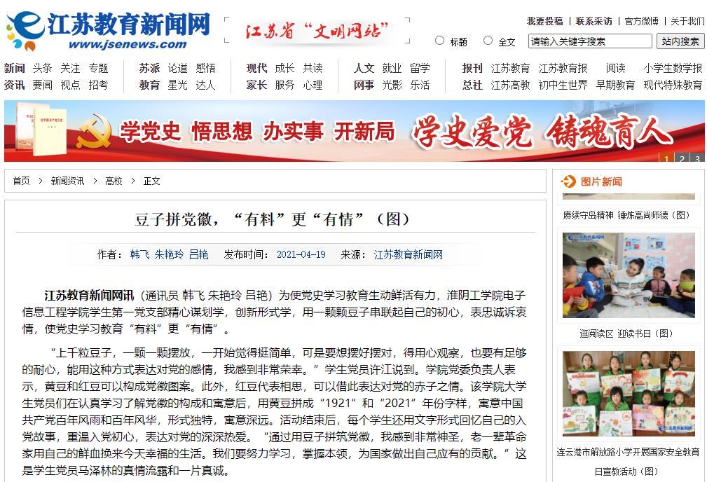 江苏教育新闻网讯(通讯员韩飞 朱艳玲 吕艳)为使党史学习教育生动鲜活有力,淮阴工学院电子信息工程学院学生第一党支部精心谋划学,创新形式学,用一颗颗豆子串联起自己的初心,表忠诚诉衷情,使党史学习教育“有料”更“有情”。