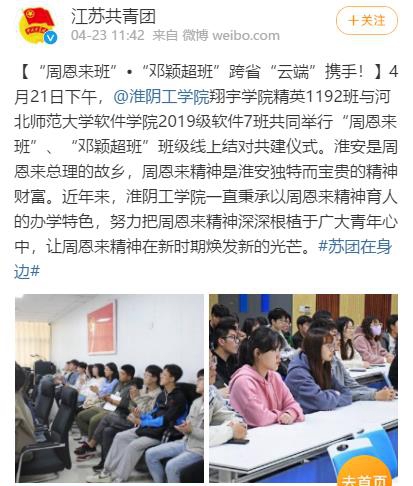 【“周恩来班”•“邓颖超班”跨省“云端”携手!】4月21日下午,@淮阴工学院翔宇学院精英1192班与河北师范大学软件学院2019级软件7班共同举行“周恩来班”、“邓颖超班”班级线上结对共建仪式。淮安是周恩来总理的故乡,周恩来精神是淮安独特而宝贵的精神财富。近年来,淮阴工学院一直秉承以周恩来精神育人的办学特色,努力把周恩来精神深深根植于广大青年心中,让周恩来精神在新时期焕发新的光芒。#苏团在身边#