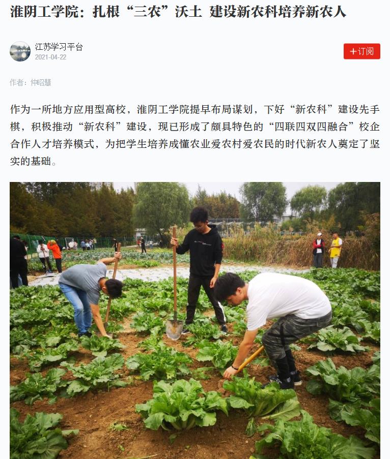 作为一所地方应用型高校,淮阴工学院提早布局谋划,下好“新农科”建设先手棋,积极推动“新农科”建设,现已形成了颇具特色的“四联四双四融合”校企合作人才培养模式,为把学生培养成懂农业爱农村爱农民的时代新农人奠定了坚实的基础。