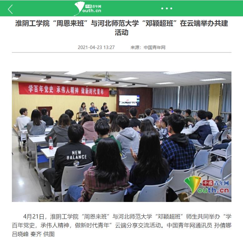 中国青年网北京4月23日电(记者 李川 通讯员 孙倩娜 吕晓峰 秦齐)4月21日,淮阴工学院翔宇学院与河北师范大学软件学院师生共同举办“学百年党史,承伟人精神,做新时代青年”云端分享交流活动,在大屏幕前,来自两个学院的学子们通过网络凝聚在了一起。