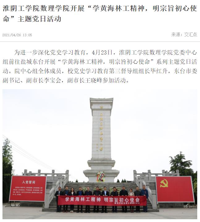 为进一步深化党史学习教育,4月23日,淮阴工学院数理学院党委中心组前往盐城东台开展“学黄海林工精神,明宗旨初心使命”系列主题党日活动。院中心组全体成员,校党史学习教育第三督导组组长毕红升,东台市委副书记、副市长李宝会,副市长王晓峰参加活动。