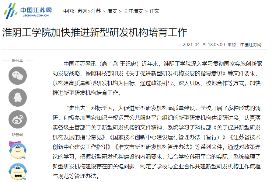 中国江苏网讯(高尚兵 王纪忠)近年来,淮阴工学院深入学习贯彻国家实施创新驱动发展战略,按照科技部印发《关于促进新型研发机构发展的指导意见》等文件要求,以构建高质量新型研发机构为目标,通过政策引导、深入县区、校地合作等方式,加快推进新型研发机构培育工作。