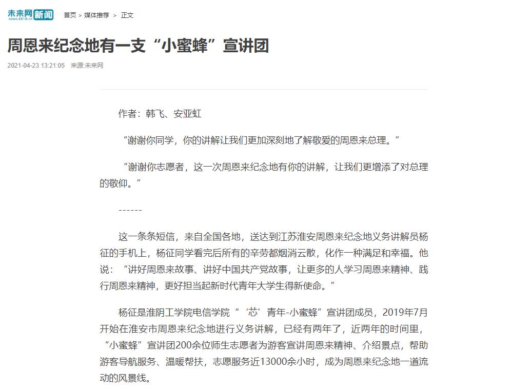 2019年6月,淮阴工学院电信学院与周恩来故居管理处共建校外志愿服务基地,成立“‘芯’青年-小蜜蜂”宣讲团。7月开始,除考试月外志愿活动常态化,每周末定期选派志愿者到周恩来故居、周恩来纪念馆、周恩来童年读书处等纪念地进行周恩来精神宣讲、景点讲解、引导接待等相关志愿活动,寒暑假每天安排一名志愿者参与志愿服务工作。