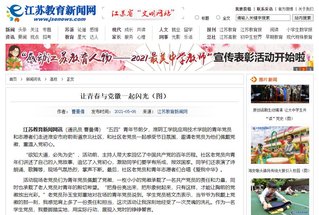 江苏教育新闻网讯(通讯员曹曼倩)“五四”青年节前夕,淮阴工学院应用技术学院的青年党员和志愿者们走进淮安市府前街道京北社区,和社区老党员一起感受节日氛围,邀请老党员为他们佩戴党徽,重温入党初心。