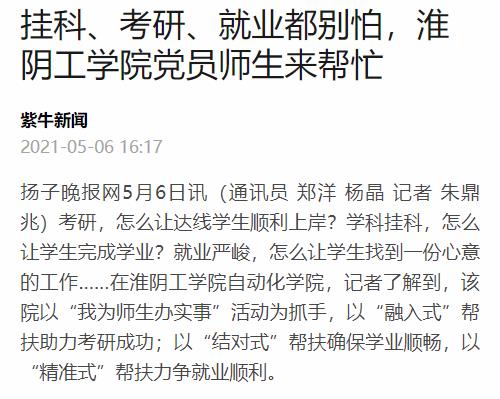 扬子晚报网5月6日讯(通讯员 郑洋 杨晶 记者 朱鼎兆)考研,怎么让达线学生顺利上岸?学科挂科,怎么让学生完成学业?就业严峻,怎么让学生找到一份心意的工作……在淮阴工学院自动化学院,记者了解到,该院以“我为师生办实事”活动为抓手,以“融入式”帮扶助力考研成功;以“结对式”帮扶确保学业顺畅,以“精准式”帮扶力争就业顺利。
