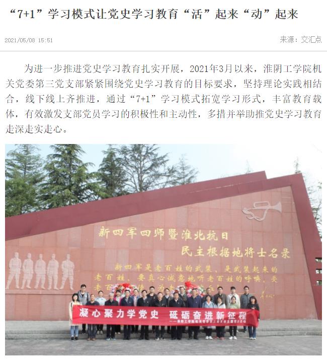 为进一步推进党史学习教育扎实开展,2021年3月以来,淮阴工学院机关党委第三党支部紧紧围绕党史学习教育的目标要求,坚持理论实践相结合,线下线上齐推进,通过“7+1”学习模式拓宽学习形式,丰富教育载体,有效激发支部党员学习的积极性和主动性,多措并举助推党史学习教育走深走实走心。