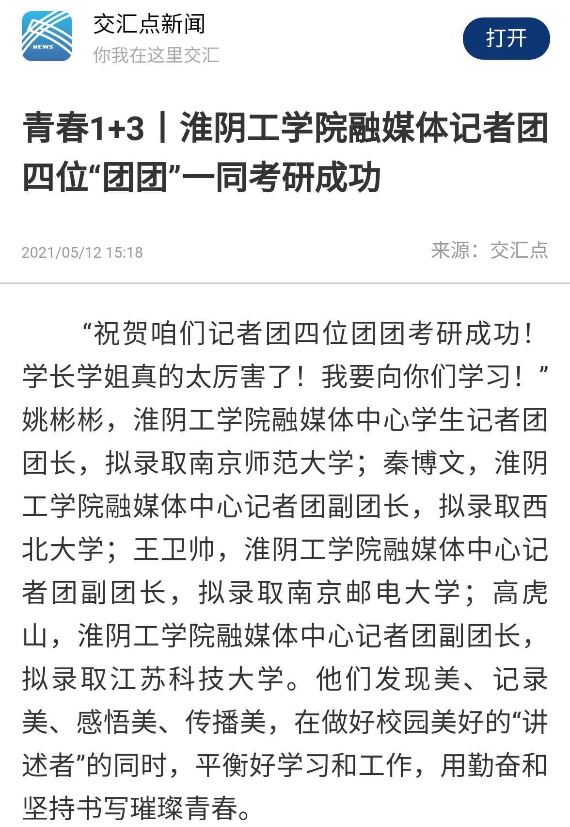 “祝贺咱们记者团四位团团考研成功!学长学姐真的太厉害了!我要向你们学习!”姚彬彬,淮阴工学院融媒体中心学生记者团团长,拟录取南京师范大学;秦博文,淮阴工学院融媒体中心记者团副团长,拟录取西北大学;王卫帅,淮阴工学院融媒体中心记者团副团长,拟录取南京邮电大学;高虎山,淮阴工学院融媒体中心记者团副团长,拟录取江苏科技大学。他们发现美、记录美、感悟美、传播美,在做好校园美好的“讲述者”的同时,平衡好学习和工作,用勤奋和坚持书写璀璨青春。