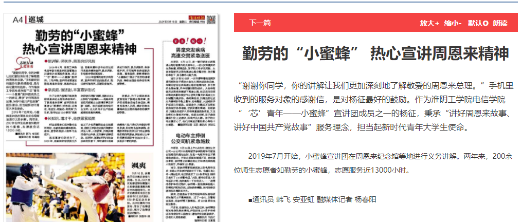 2019年6月,淮阴工学院电信学院与周恩来故居管理处共建校外志愿服务基地,成立“‘芯’青年——小蜜蜂”宣讲团。7月开始,宣讲团志愿者定期到周恩来故居、周恩来纪念馆、周恩来童年读书处旧址进行周恩来精神宣讲、景点讲解、引导接待等志愿服务。