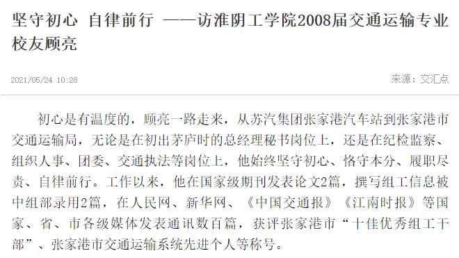 初心是有温度的,顾亮一路走来,从苏汽集团张家港汽车站到张家港市交通运输局,无论是在初出茅庐时的总经理秘书岗位上,还是在纪检监察、组织人事、团委、交通执法等岗位上,他始终坚守初心、恪守本分、履职尽责、自律前行。工作以来,他在国家级期刊发表论文2篇,撰写组工信息被中组部录用2篇,在人民网、新华网、《中国交通报》《江南时报》等国家、省、市各级媒体发表通讯数百篇,获评张家港市“十佳优秀组工干部”、张家港市交通运输系统先进个人等称号。