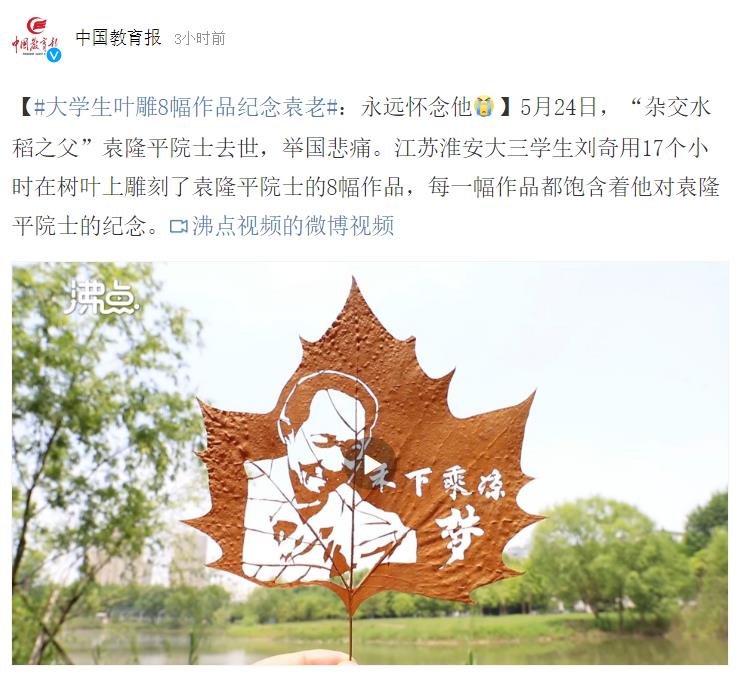 5月24日,“杂交水稻之父”袁隆平院士去世,举国悲痛。江苏淮安大三学生刘奇用17个小时在树叶上雕刻了袁隆平院士的8幅作品,每一幅作品都饱含着他对袁隆平院士的纪念。