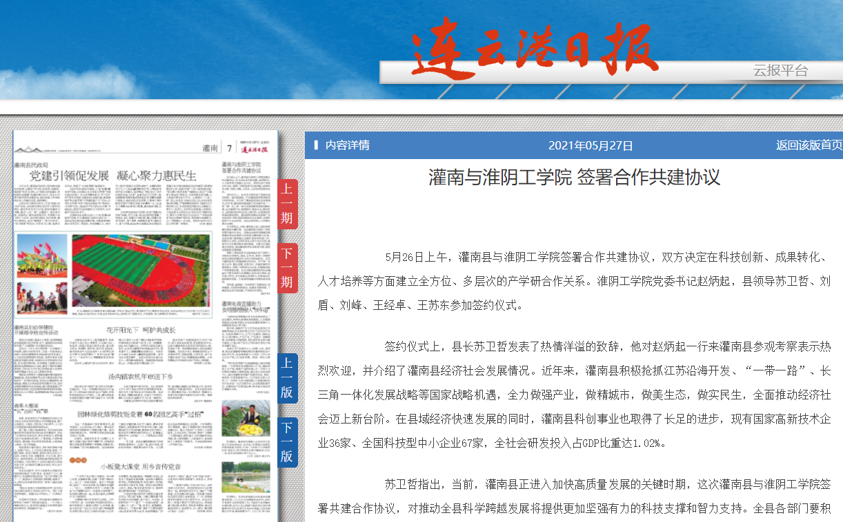 5月26日上午,灌南县与淮阴工学院签署合作共建协议,双方决定在科技创新、成果转化、人才培养等方面建立全方位、多层次的产学研合作关系。淮阴工学院党委书记赵炳起,县领导苏卫哲、刘盾、刘峰、王经卓、王苏东参加签约仪式。