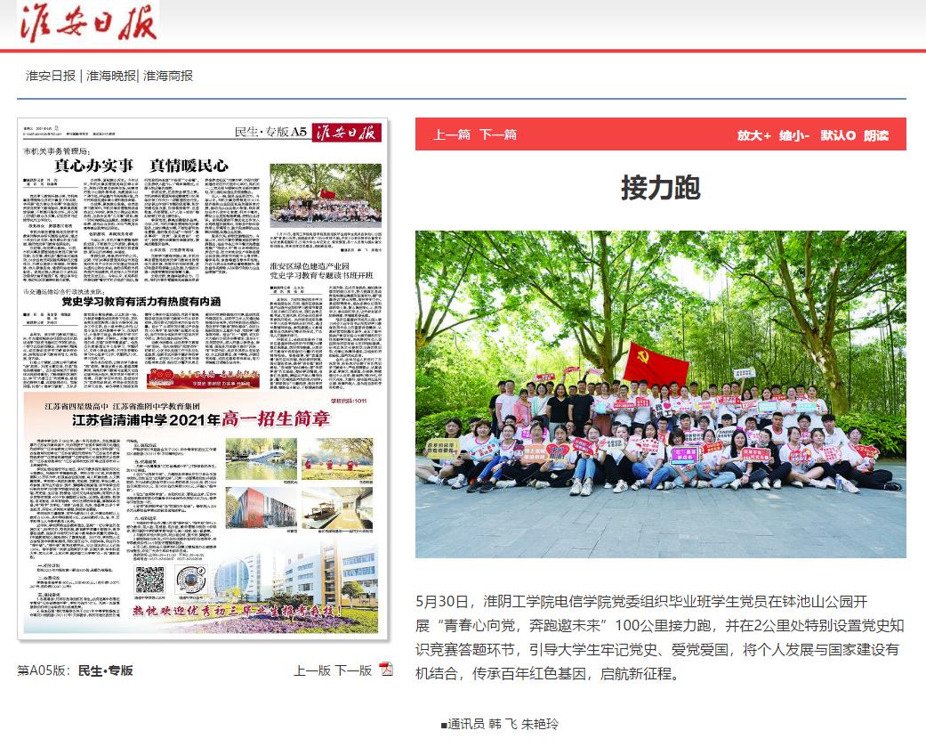 5月30日,淮阴工学院电信学院党委组织毕业班学生党员在钵池山公园开展“青春心向党,奔跑邀未来”100公里接力跑,并在2公里处特别设置党史知识竞赛答题环节,引导大学生牢记党史、爱党爱国,将个人发展与国家建设有机结合,传承百年红色基因,启航新征程。