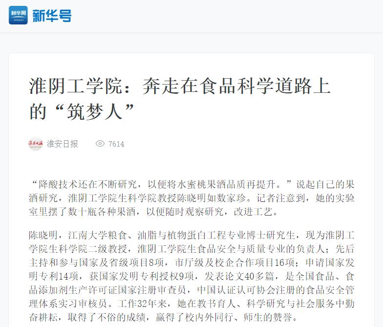陈晓明,江南大学粮食、油脂与植物蛋白工程专业博士研究生,现为淮阴工学院生科学院二级教授,淮阴工学院生食品安全与质量专业的负责人;先后主持和参与国家及省级项目8项,市厅级及校企合作项目16项;申请国家发明专利14项,获国家发明专利授权9项,发表论文40多篇,是全国食品、食品添加剂生产许可证国家注册审查员,中国认证认可协会注册的食品安全管理体系实习审核员。工作32年来,她在教书育人、科学研究与社会服务中勤奋耕耘,取得了不俗的成绩,赢得了校内外同行、师生的赞誉。