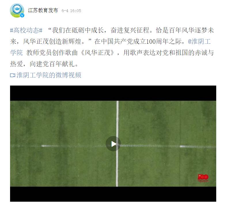 “我们在砥砺中成长,奋进复兴征程。恰是百年风华逐梦未来,风华正茂创造新辉煌。”在中国共产党成立100周年之际,@淮阴工学院教师党员创作歌曲《风华正茂》,用歌声表达对党和祖国的赤诚与热爱,向建党百年献礼。