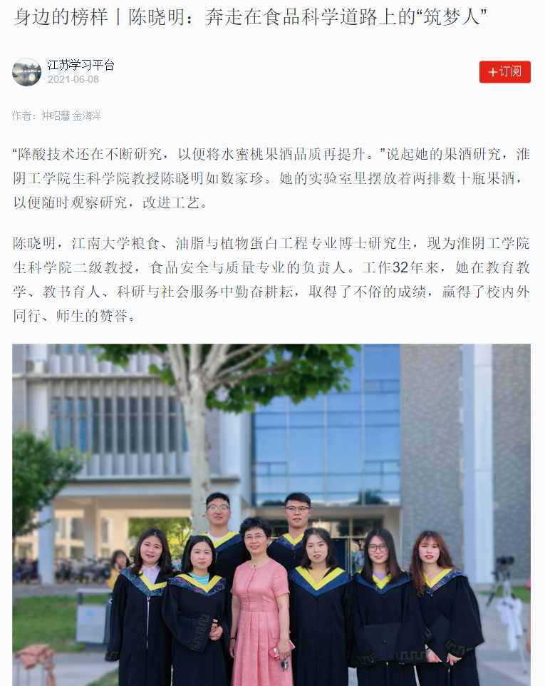 陈晓明,江南大学粮食、油脂与植物蛋白工程专业博士研究生,现为淮阴工学院生科学院二级教授,食品安全与质量专业的负责人。工作32年来,她在教育教学、教书育人、科研与社会服务中勤奋耕耘,取得了不俗的成绩,赢得了校内外同行、师生的赞誉。