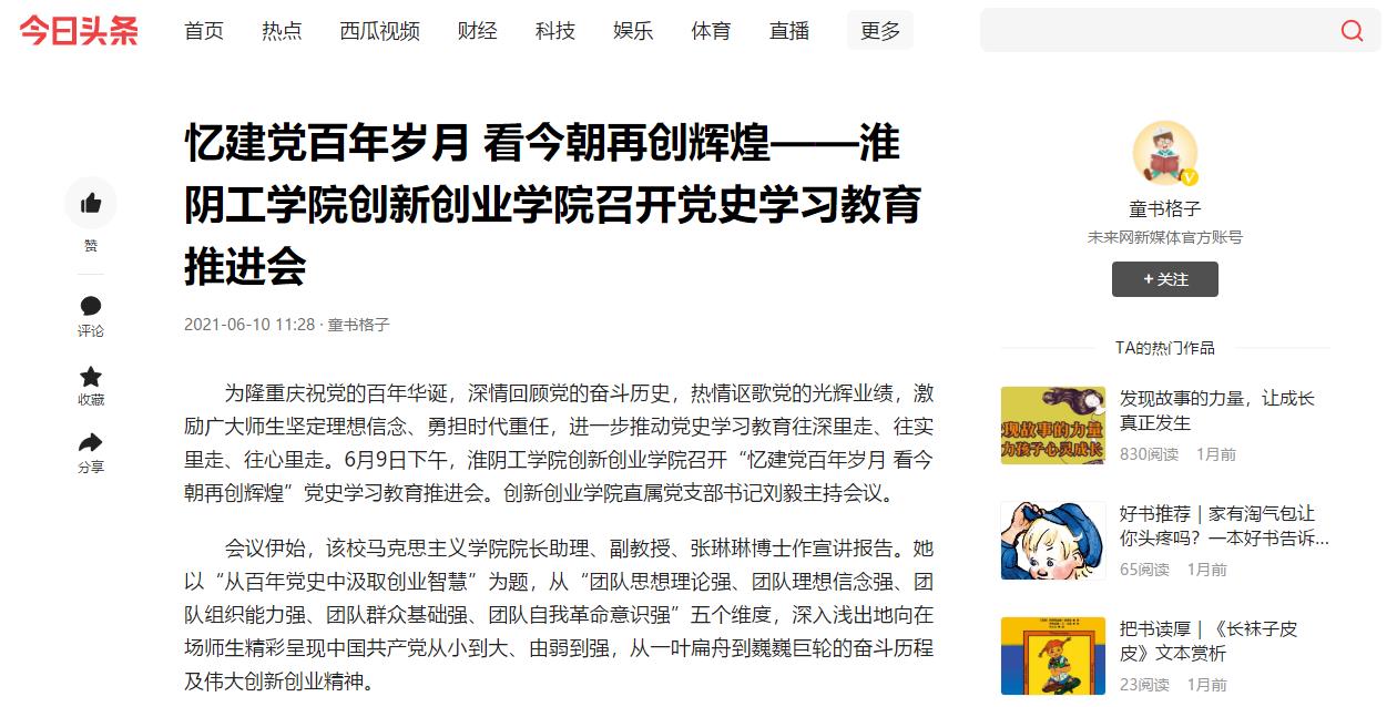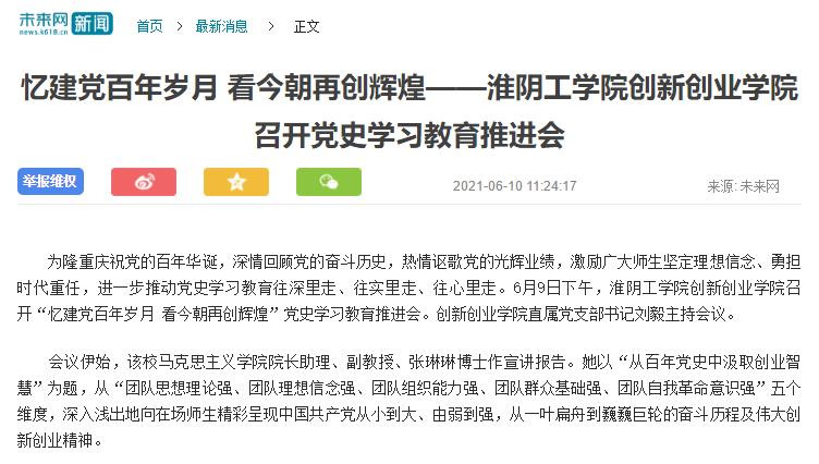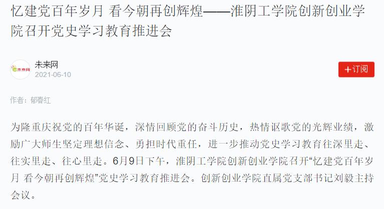 为隆重庆祝党的百年华诞,深情回顾党的奋斗历史,热情讴歌党的光辉业绩,激励广大师生坚定理想信念、勇担时代重任,进一步推动党史学习教育往深里走、往实里走、往心里走。6月9日下午,淮阴工学院创新创业学院召开“忆建党百年岁月 看今朝再创辉煌”党史学习教育推进会。创新创业学院直属党支部书记刘毅主持会议。
