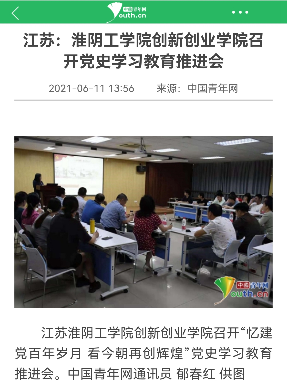 江苏淮阴工学院创新创业学院召开“忆建党百年岁月 看今朝再创辉煌”党史学习教育推进会。中国青年网通讯员 郁春红 供图