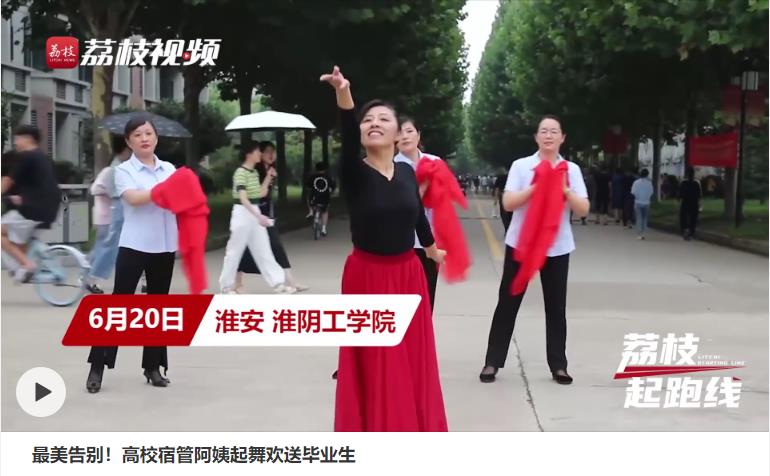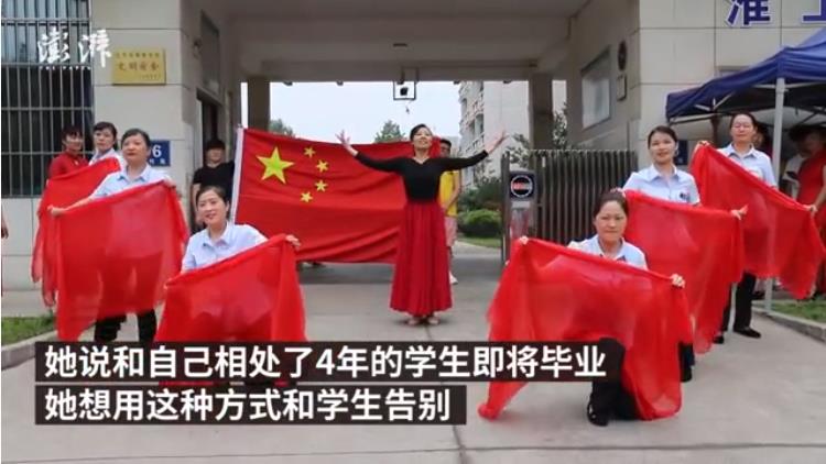 6月20日,江苏淮安。宿管徐红带几名同事,在宿舍楼前跳古典舞,她说学生即将毕业,想用这种方式和他们告别,为他们送上祝福。有毕业生称宿管像妈妈,感谢她四年的照顾。