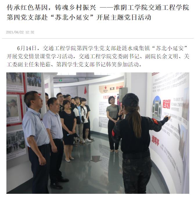 6月14日,交通工程学院第四学生党支部赴涟水成集镇“苏北小延安”开展党史情景课堂学习活动,交通工程学院党委副书记、副院长余文明、关工委副主任朱艳茹、第四学生党支部书记韩笑参加活动。