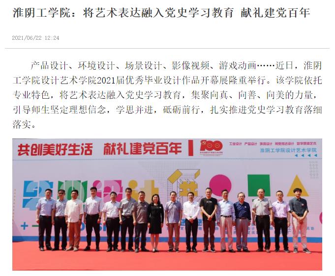 产品设计、环境设计、场景设计、影像视频、游戏动画……近日,淮阴工学院设计艺术学院2021届优秀毕业设计作品开幕展隆重举行。该学院依托专业特色,将艺术表达融入党史学习教育,集聚向真、向善、向美的力量,引导师生坚定理想信念,学思并进,砥砺前行,扎实推进党史学习教育落细落实。