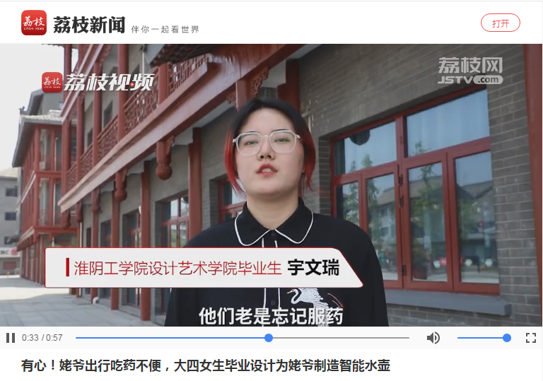 淮阴工学院设计艺术学院大四女生宇文瑞毕业设计制作智能水壶,具备储物、储药、提醒服药等功能方便老人外出。从草稿、定稿、3D建模、3D打印到智能化配置,宇文瑞一共花了一个多月时间。她说:姥爷喜欢旅游,这款水壶是针对他的身体机能和心理需求设计的,也作为自己毕业时送给姥爷的生日礼物。