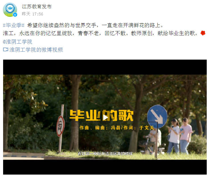 希望你继续盎然的与世界交手,一直走在开满鲜花的路上。淮工,永远在你的记忆里绽放,青春不老,回忆不散。教师原创,献给毕业生的歌。