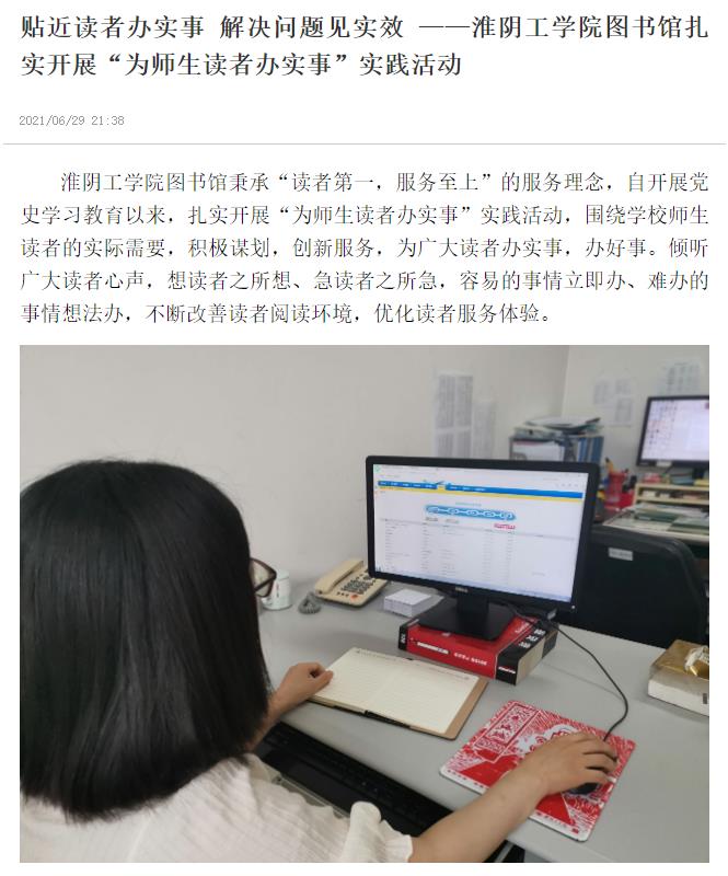 淮阴工学院图书馆秉承“读者第一,服务至上”的服务理念,自开展党史学习教育以来,扎实开展“为师生读者办实事”实践活动,围绕学校师生读者的实际需要,积极谋划,创新服务,为广大读者办实事,办好事。倾听广大读者心声,想读者之所想、急读者之所急,容易的事情立即办、难办的事情想法办,不断改善读者阅读环境,优化读者服务体验。