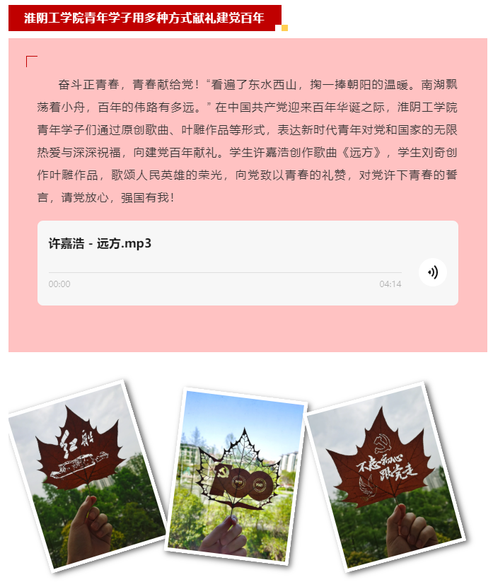 奋斗正青春,青春献给党!“看遍了东水西山,掬一捧朝阳的温暖。南湖飘荡着小舟,百年的伟路有多远。” 在中国共产党迎来百年华诞之际,淮阴工学院青年学子们通过原创歌曲、叶雕作品等形式,表达新时代青年对党和国家的无限热爱与深深祝福,向建党百年献礼。学生许嘉浩创作歌曲《远方》,学生刘奇创作叶雕作品,歌颂人民英雄的荣光,向党致以青春的礼赞,对党许下青春的誓言,请党放心,强国有我!