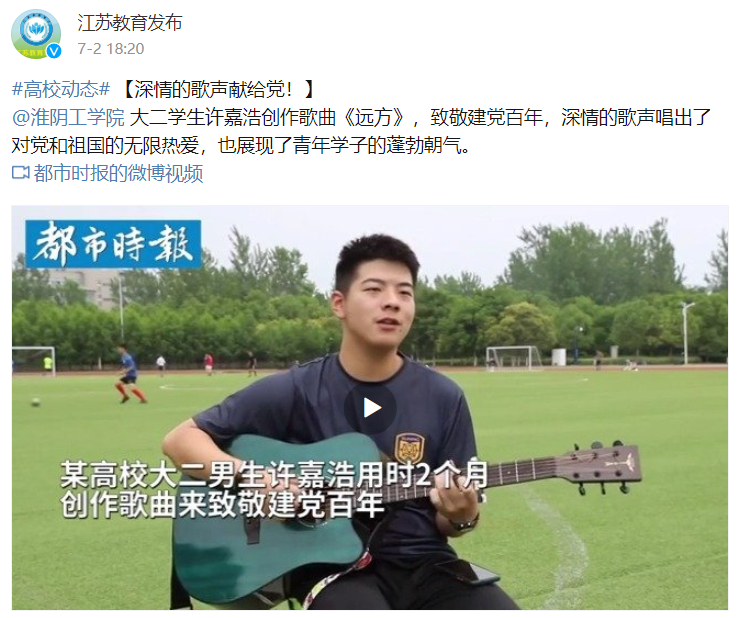 淮阴工学院大二学生许嘉浩创作歌曲《远方》,致敬建党百年,深情的歌声唱出了对党和祖国的无限热爱,也展现了青年学子的蓬勃朝气。