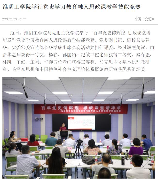 近日,淮阴工学院马克思主义学院举行“百年党史铸辉煌 思政课堂谱华章”党史学习教育融入思政课教学技能竞赛。党委副书记、副校长吴建华,党委常委宣传部长华学成出席竞赛活动并担任评委。经过激烈角逐,由新华老师获得一等奖,杨春、孙丽娟、纪敏三位老师获得二等奖,秦存强、林凯、王红、庄褀、许奔五位老师获得三等奖,马克思主义基本原理教研室、毛泽东思想和中国特色社会主义理论体系概论教研室获优秀组织奖。