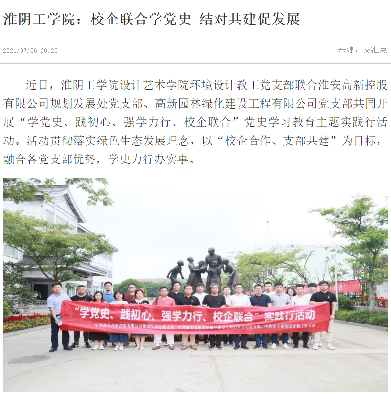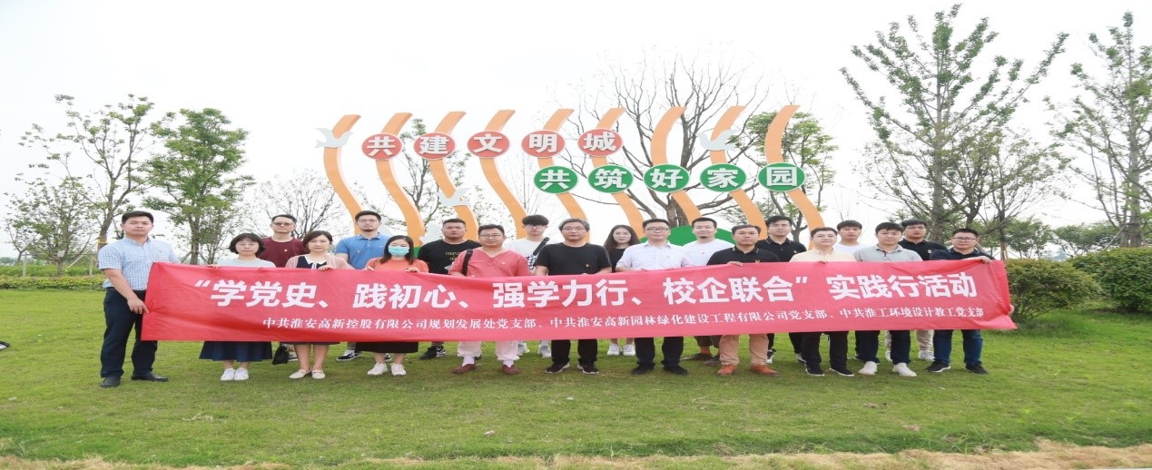 近日,淮阴工学院设计艺术学院环境设计教工党支部联合淮安高新控股有限公司规划发展处党支部、高新园林绿化建设工程有限公司党支部共同开展“学党史、践初心、强学力行、校企联合”党史学习教育主题实践行活动。活动贯彻落实绿色生态发展理念,以“校企合作、支部共建”为目标,融合各党支部优势,学史力行办实事。